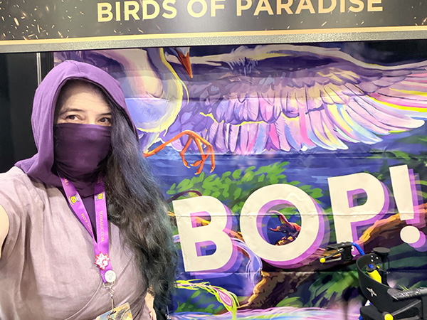 She was invited to attend MagicCon as part of the Birds of Paradise (BOP) organization, a women-led community dedicated to making marginalized communities feel welcome by making space for them at the gaming table. Many women, queer and disabled people, as well as people of color, have experienced bullying and other issues within the gaming community. BOP handed out rainbow badge ribbons that read, “You can sit with us.”