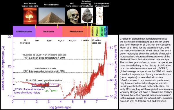 In followup comments, Kargel said “Alarmingly, politicians are demanding to operate Planet Earth on naïve whims, ignoring expert guidance. With controlled emissions, climate near Eugene, Oregon, for instance, may stabilize like today’s Georgia. Lacking controls, it will become subtropical by 2100 and approach the climate of today’s Panama by 2150, as exemplified by Eocene fossils of John Day Fossil Beds National Monument, Oregon (http://npshistory.com/publications/joda/nrr-2014-846.pdf).