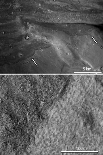 Visible light images showing older tsunami lobate upper reaches (white arrows) that embay local highland hills. The image below reveals the deposit’s bouldery substrate. Up is towards the bottom right of the images. These images are part of Fig. S3. Lead author Alexis Rodriguez created this figure.