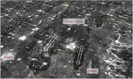 *In May 2013, the Saskatchewan Water Security Agency filmed an ice surge in the Codette Reservoir near Nipawin, Saskatchewan, Canada. The surge comprises a spectacular terrestrial analog of rarely observed catastrophic slurry ice-rich flows leading to the emplacement of enormous lobate fronts, which are strikingly similar to those shown in this image; video link: https://www.youtube.com/watch?v=OgMBQFf64JM