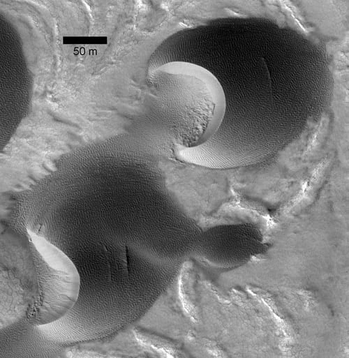 Other factors limiting dune movement on Mars would include the planet’s thin atmosphere, which requires very high wind speeds to provide the force needed to move sand, and the water and carbon-dioxide frosts that cover dunes in Mars’ polar regions for 70 percent of the year, Bourke said.