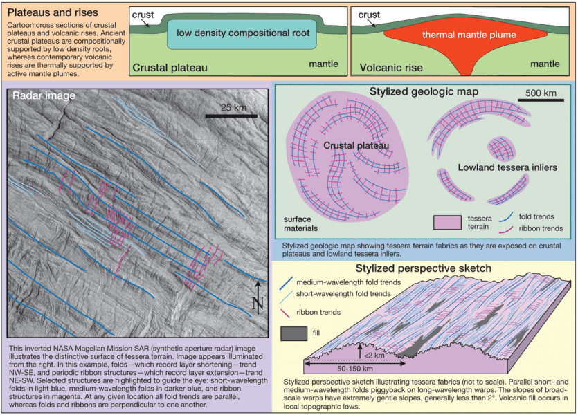 Venus’ crustal plateaus and its distinctive tessera terrain are believed to be the oldest features on Venus. Tessera is defined by wide folded terrain criss-crossed by ribbon structures. Hansen describes them as forming from vast lava ponds formed when large impactors battered Venus’ ancient surface. Today, the history of our solar system just might be locked in these two very separate and yet very similar terrains. To learn more, check out Hansen’s very readable article.