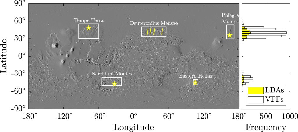 They also identified another area on Mars where SHARAD, short for the SHAllow RADar instrument onboard the Mars Reconnaissance Orbiter, could also do these analyses. This gave them a total of five sites spread across the red planet, enabling global comparison.