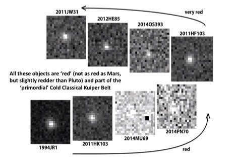 In the fall of 2015 the team observed one object, 15810 Arawn (1994 JR1) simultaneous with New Horizons and HST. In the summer of 2016 we observed seven more objects, inclusive of Ultima Thule (HST GO-14092, PI Benecchi; Figure 1). We collected data in two different filters, F606W and F814W (effectively a green and red filter) using the high resolution Wide Field Camera 3 (WFC3) with the goal of determining the colors of the objects and to see if they were consistent with the apparent dynamical classifications of the objects.