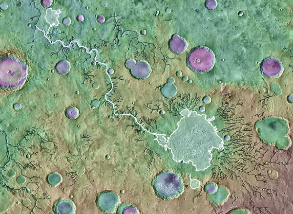 Light blue areas on the map surrounding Orson Welles show regions where the water overspilled the edge of the crater. This overspill has not previously been documented. The crater wall was breached to the northeast and Shalbatana Vallis was formed. The same process occurred in the collapse region to the east of Orson Welles named Aromatum Chaos, leading to the outflow channel Ravi Vallis extending to the east. Aromatum Chaos and Ravi Vallis also show previously unseen regions of overspill. Multiple levels of chaotic terrain and channel floor materials indicate multiple episodes of flooding interspersed with