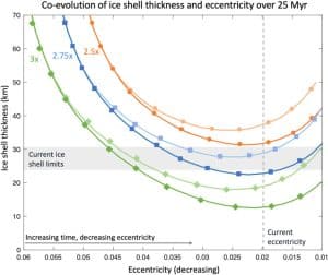 “Eccentricity is what drives the tidal heating. Right now it is very high as compared with other active ocean moons, like neighboring Enceladus. We think that tidal heating is the heat source responsible for currently thinning the shell,” Walker said. “Tidal heating is not free energy though, so as it melts the shell, it pulls energy out of the orbit, which drops that eccentricity until it eventually circularizes it and shuts the whole thing down.”