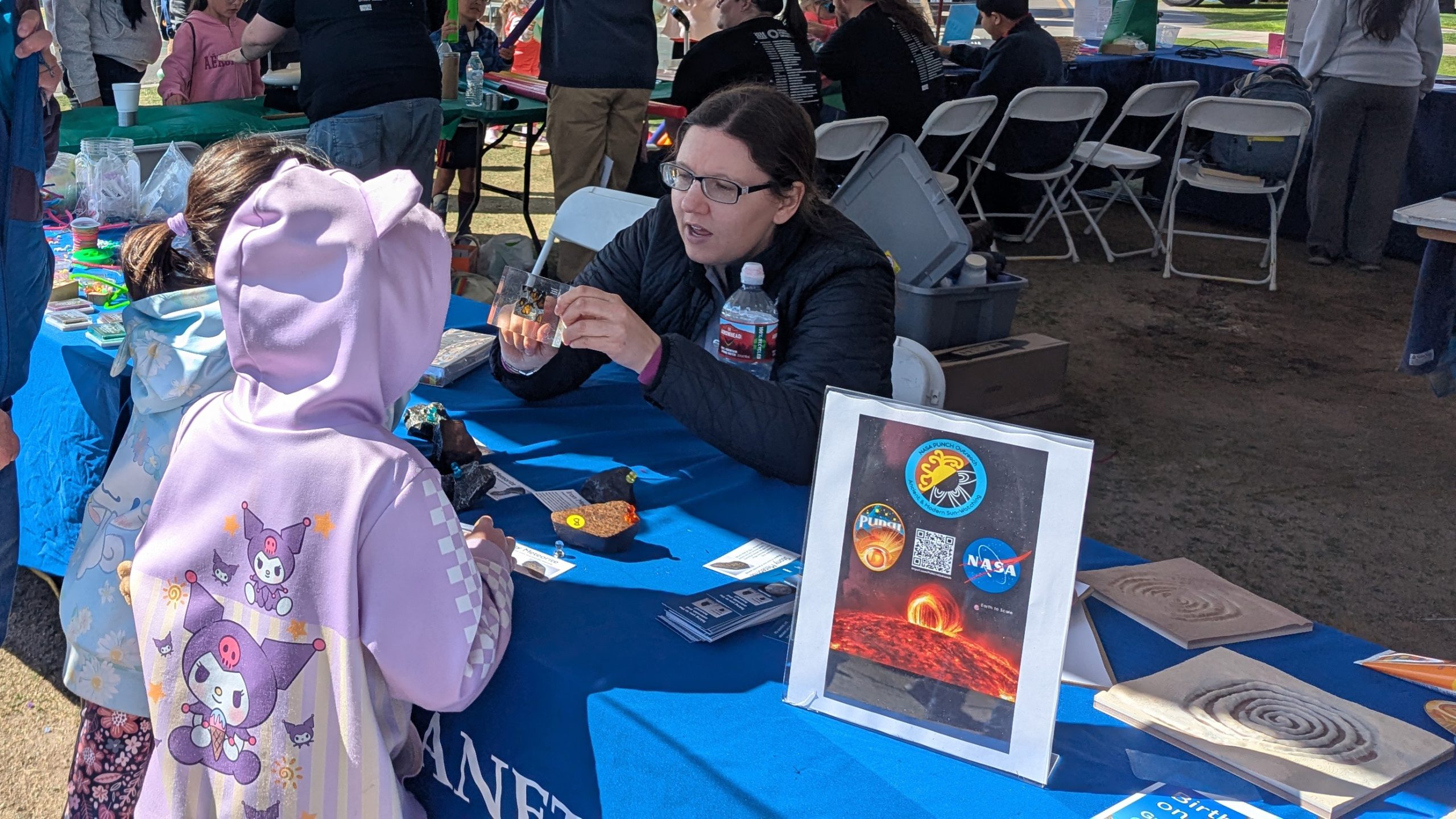 An estimated 1,200 visitors over two days visited PSI’s display within Science City, a subsection of the festival tailored to children. PSI volunteers shared meteorites to talk about Solar System exploration. They also set up activities from NASA’s PUNCH Mission to prompt discussion about the Sun, including an activity called “Birthdays on the Chaco Horizon,” which featured an image from the Chaco Culture National Historical Park in New Mexico, 3-D prints featuring petroglyphs found in Chaco Culture National Historical Park, in addition to three-hole pinhole projectors that can be used by visitors to safely project the Sun.