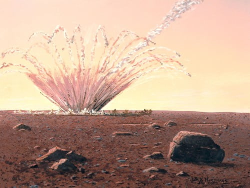 PSI co-founder William K. Hartmann painted this artist’s conception of an asteroid impact on Mars. Similar explosions formed many of craters that international space probes have observed on the red planet.