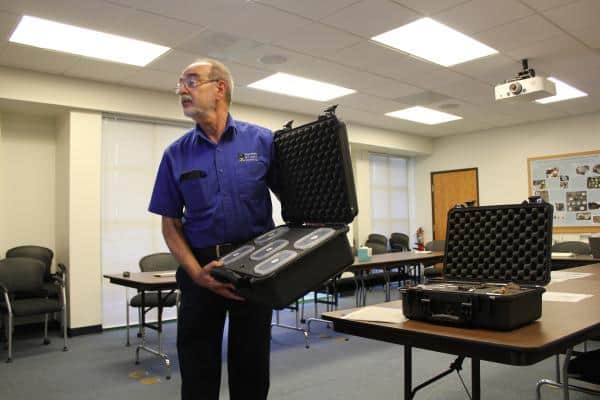 Lebofsky, presenting to a remote audience, pointed out the contents of the regular meteorite kits, as well as the small ones containing smaller samples. Five of the small kits fit into one shipping case. PSI has three of the large kits and four of the small ones.
