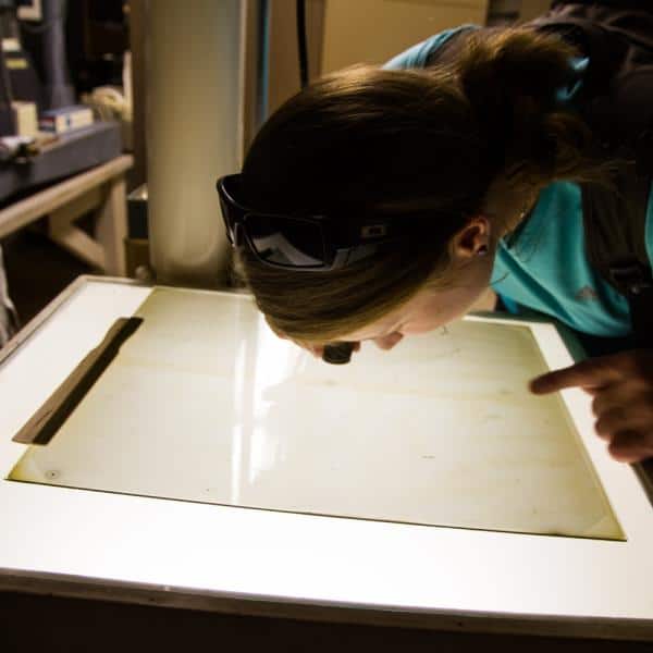 Le Corre studies the Pluto discovery photographic plate in the archives of Lowell Observatory.