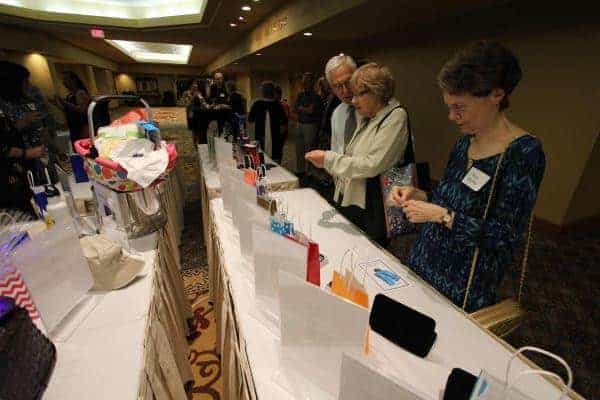 Below, guests browse through the 46 raffle items offered at the dinner.