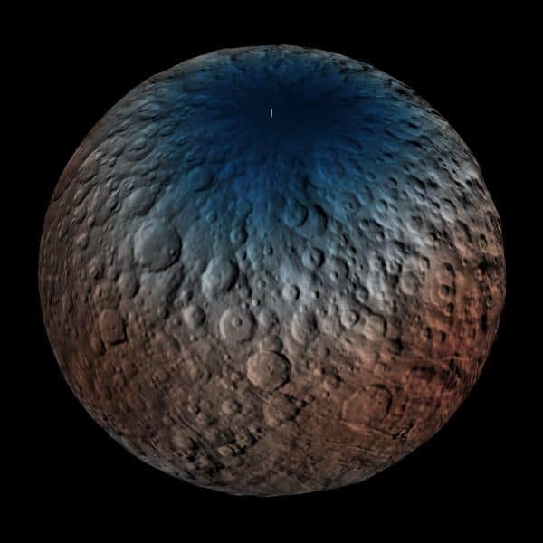 Above, This map of neutron counting data at Ceres was acquired by Dawn’s gamma ray and neutron detector (GRaND) instrument. The data comes from Dawn’s low-altitude mapping orbit at Ceres, which is at a distance of 240 miles (385 kilometers) from the dwarf planet. The color scale of this map is from blue (lowest) to red (highest). This data, based on number of neutrons detected per second, reflects the concentration of hydrogen in the upper yard (meter) of regolith. Counts decrease with increasing hydrogen concentration. A portion of the northern hemisphere of Ceres is shown. The pole is marked with a white line. The longitude is centered on Occator Crater. Lower neutron counts near the pole suggest the presence of water ice within about a yard (meter) of the surface at high latitudes.