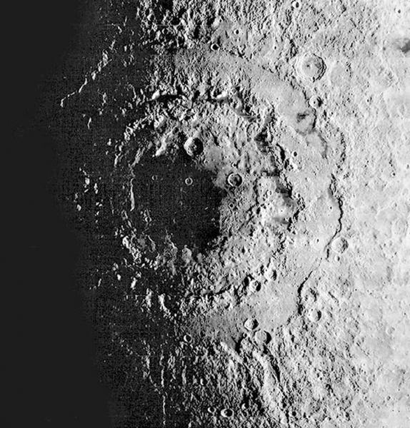 In past years, some lunar scientists proposed that the largest visible impact scar on the Moon may be the region known as ‘Oceanus Procellarum,’ a depressed, lava-covered region visible to the naked eye. It is partly obliterated by the more recent “Imbrium Impact Basin,” dated by many Apollo mission rock samples at age 3.9 billion years. However, the gravity-mapping team using the “GRAIL” orbiting instrument in 2011-12 argued against Procellarum being impact-related, because they found linear, not circular, structures surrounding Oceanus Procellarum below the Moon’s surface. These they interpreted “as part of the lunar magma plumbing system – the conduits that fed lava to the surface during ancient volcanic eruptions.” The Hartmann and Morbidelli illustration shows, however, that linear elements alone do not disprove an impact origin. The “rings” around Orientale and other basins contain linear elements, marked in white lines in the color image below. The illustration also shows that giant impacts created parts of the “lunar plumbing system.” The innermost white line (east side) can be seen in the black and white photo to have lava extrusions all along its base. In other words, as has been known for several decades, the linear segments in the “rings” of impact basins did “feed lava to the surface.”