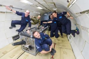 Kirby Runyon (bottom) and the science team experience a moment of weightlessness during the flight. Credit: Zero-G/Steve Boxall.