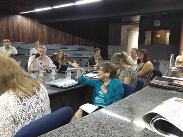 Above, Jeff Mortenthaler and Julie Rathbun pose with a banner from the workshop in Brazil.
