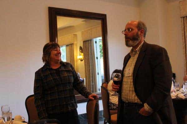 Above, Vicki Hansen and David Crown chat during a reception held prior to the dinner at the Arizona Inn.