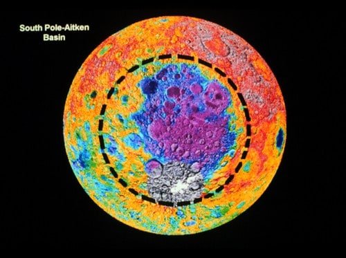 South Pole-Aitken Basin, the largest and deepest impact basin in the solar system, is likely to be one of the primary targets for lunar rovers. This view, which is centered on the basin, consists of color-coded topography overlaid on a shaded relief representation of the Moon. Purple and blue are low, and orange and red are high. The basin is up to 13 kilometers deep, with an average depth of about 10 kilometers. Rovers may find volcanic evidence in the basin that could help unravel the moon’s thermal evolution. (Image Credit: Clementine Science Group, Lunar and Planetary Institute)