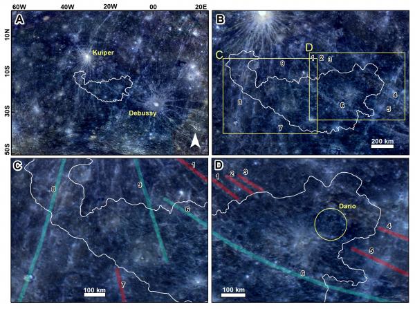 Fig. 1 Extent of a vast chaotic terrain (white outline) at the antipode of the Caloris basin (~5 x 105 km2).