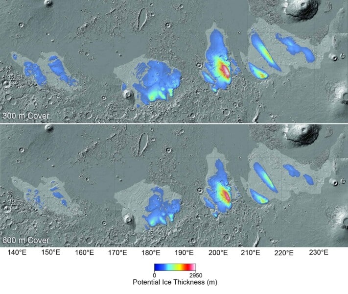 “If this is ice, it would represent the most substantial low-latitude ice ever detected on Mars. From a human mission perspective, ice represents a valuable resource for life support and to generate fuel for the return trip home,” said Planetary Science Institute Senior Scientist Gareth A. Morgan, a co-author on the paper. “Low latitudes are also very desirable for multiple reasons, the most important being temperature and solar energy due to the relatively high Sun angles. However, the potential ice deposits are buried under hundreds of meters of dry material and would be very difficult to extract.”
