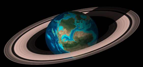 The moon will continue to move farther away from Earth until the Earth’s rotation has slowed to the point where both the Moon and Earth keep the same sides facing each other at all times. But the story doesn’t end there. Earth will continue to slow down because of tides raised on Earth by the Sun. As Earth begins rotating more slowly than the Moon orbits, the influence of tides will cause the Moon to start getting closer to Earth. This is currently happening to the Martian moon Phobos. Phobos orbits Mars faster than Mars rotates and tides on Mars are causing Phobos to move slowly towards the red planet. For the Earth-Moon system, in a few billion years our Moon will be so close to Earth that Earth’s gravity pulls it apart. When that happens the debris from the Moon will form a ring system around Earth much like Saturn’s ring system. The image below is what Earth might look like in a few billion years with a ring system and continents in a totally different configuration than today because of plate tectonics.