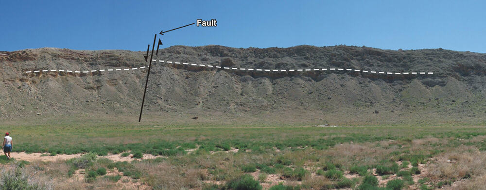 Tear Fault at the Southeast Corner of Barringer Crater Photo: G. Osinski, Canadian Space Agency Location: Center of the crater floor Scale: Height from the floor to the crater rim is approximately 180 meters In this photo, notice how a prominent layer of the Kaibab Formation (dashed white line) is offset along a fault. | ![]() |