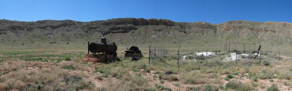 Equipment from Drilling Operation on the Crater Floor Photo: G. Osinski, Canadian Space Agency Location: Center of the crater floor Scale: Height from the floor to the crater rim is approximately 180 meters In this photo are the remains of a steam boiler and winch that were used to operate the hoist in the main drill shaft. The shaft, located very close to the center of the crater, was expected to encounter the large iron meteorite that Daniel Barringer thought was buried beneath. However, none was encountered and he later concluded that most of the meteorite impactor had either melted, vaporized, or been ejected out of the crater. To learn more about Daniel Barringer’s early exploration of Barringer Crater, visit The Barringer Meteorite Crater website. | ![]() |