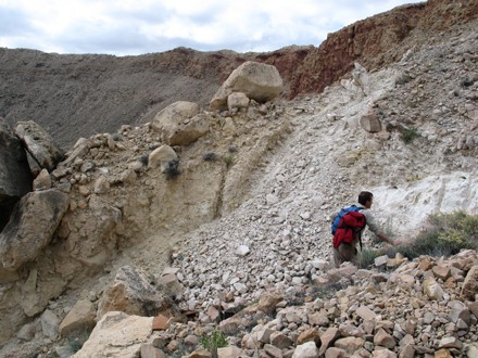 A scientist examines the contact (at head height) of the impact breccias (bright material) with overlying talus deposits. The latter are more recent and continue to be formed at the present day as the crater walls are being eroded.