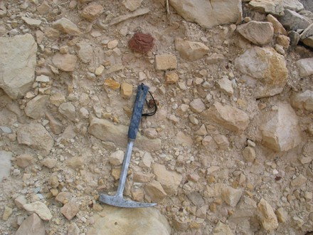 If we take a closer look, we can see that a variety of rocks have been mixed together to form a new rock: impact breccias. Notice the brick red fragments of Moenkopi Formation– there’s a large one just above the rock hammer. These breccias represent material that was excavated, mixed together, and transported outwards from the center of the crater as it was being formed.