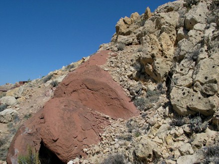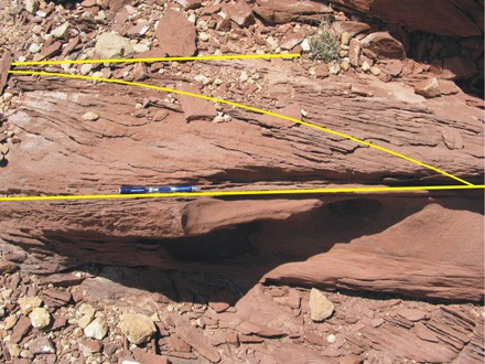 The second way we can tell if a layer of rock is upside down is to look at the geometry of the “crossbedding” or “cross-stratification”. These curved sets of small-scale layers are the relics of ancient dunes and ripples in sandstones and other sedimentary rocks (see the image above). In the Moenkopi Formation, the top of each crossbed is truncated by a steeper angle at the top than at the bottom. With this in mind, look at the photo again. Can you see that the angle made by the crossbeds at the bottom is greater than at the top? This indicates that this layer of rock is upside down.