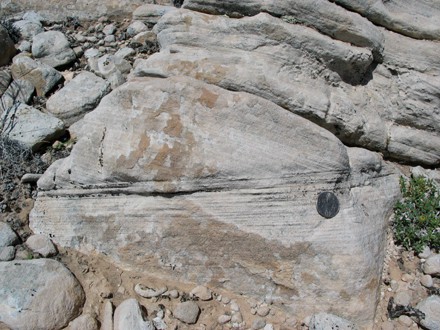 At this stop there are abundant sandstone fragments in the ejecta blanket. These rocks are from the Coconino Formation, which forms the deepest section of the target sequence at Barringer Crater. In other words, these sandstones were excavated from as much as 100-200 meters in depth and thrown out as the crater was being formed. Before we continue along the rim, we’ll take a slight detour and take a closer look at the ejecta blanket outside the crater.