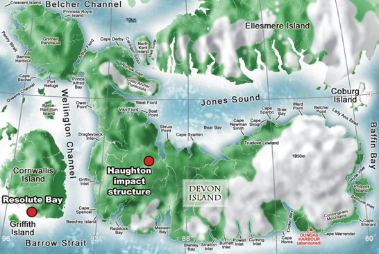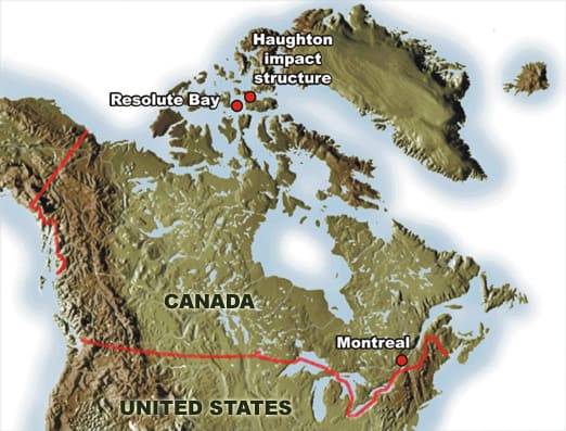 The Haughton impact structure is located on Devon Island, Canada (75° 22′ N, 89° 41′ W), in one of the most isolated regions on Earth: the Canadian High Arctic far above the Arctic Circle. This makes getting there a challenge!