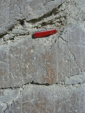 Closer inspection of the fault plane reveals vertical grooves on the surface. These are called slickenside lineations and they tell us how the two blocks of rock slid past each other. In this case, the blocks moved vertically (up or down) with respect to one other. For a diagram explaining the different types of faults, click here.