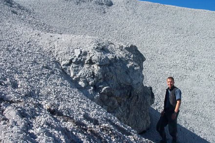 Geologist Gordon Osinski stands next to a large block of gneiss. Before the impact event, this material was located at a depth of two kilometers or more below the surface. Within seconds after the impact occurred, the rocky material was shocked, melted, mixed with other rocks in the area, and brought up to the surface.