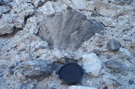 If you look more closely at the block of gneiss, you can see the true nature of these breccias– they are composed of angular, broken rock fragments called clasts. The clasts are carbonate rocks held together by a fine-grained cement or matrix. The large clast in the center is yet another shatter cone, which you first saw at Stop 3.