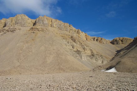 As you can see from these pictures, the layers of rock near the tops of the canyon walls are nearly all horizontal. They are sedimentary rocks, primarily limestones. These rocks were laid down approximately 380-450 million years ago when the region was covered by shallow tropical seas. The rocks approximately 15 kilometers to the west of this location were also horizontal when the impact occurred 23 million years ago. Keep this in mind as we go from stop to stop on our Haughton tour. If you notice any rocks that are NOT horizontal, then its safe to assume that these rocks were deformed and moved around by the impact event.