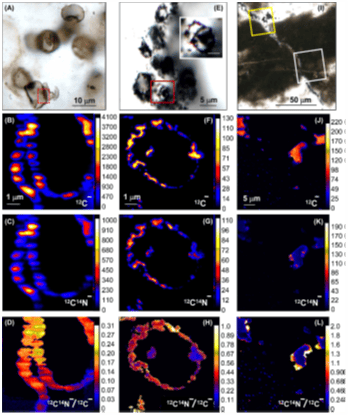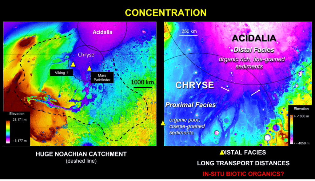 LEFT: Acidalia Planitia, Mars. Prediction of catchment and fluvial facies for organic concentration. RIGHT: Comparison of Precambrian organic microfossils and abiotic organics by optical microscopy and NanoSIMS.