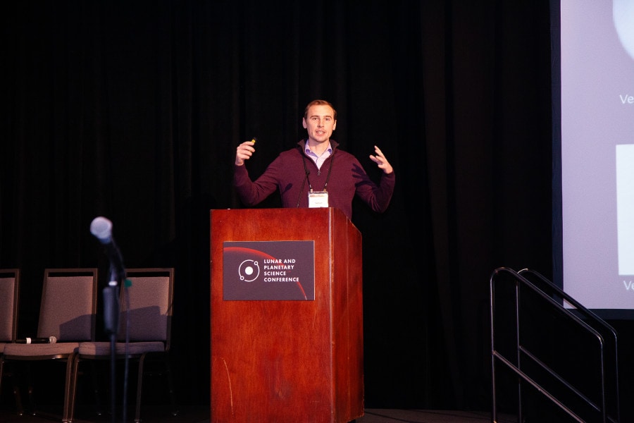 Samuel holding a lunar sample (left) and Samuel giving a presentation at the Lunar and Planetary Science Conference.